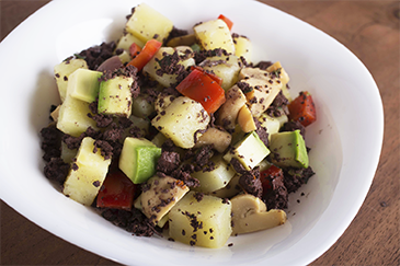 En un bowl agrega las papas cortadas y sancochadas, los champiñones salteados, los pimientos y la Sangrecita Redondos, la palta en cubos, sazona con sal y pimienta, agrega la mayonesa y revuelve bien.