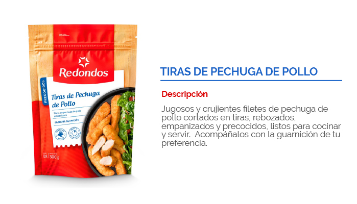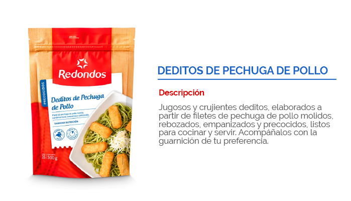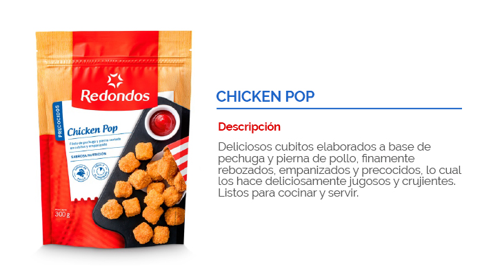 Producto elaborado a partir de filetes de pechuga de pollo molida, mezclada con condimentos y especias, moldeado en forma circular, empanizado, pre frito, congelado y empacado. Listos para freír. No necesitan descongelarse. Son ideales para la lonchera de los niños, para acompañar un plato principal o para un piqueo. ¡Deliciosos, prácticos y nutritivos!.