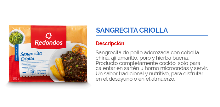 Sangrecita de pollo aderezada con cebolla china, ají amarillo, poro y hierba buena. Producto completamente cocido, solo para calentar en sartén u horno microondas y servir. Un sabor tradicional y nutritivo, para disfrutar en el desayuno o en el almuerzo.